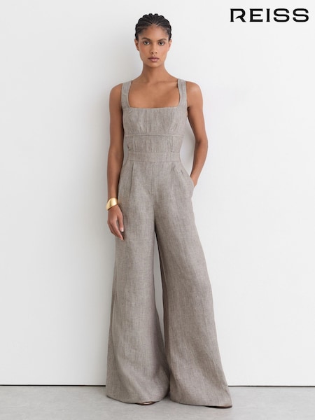 Reiss Neutral Flora Linen Structured Wide-Leg Jumpsuit