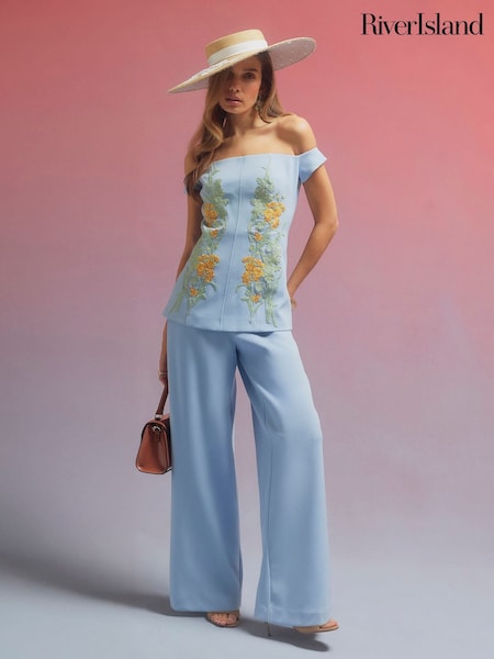 River Island Blue Scallop Collar Linen Blend Jumpsuit