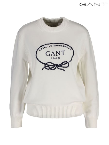 GANT White Stretch Cotton Cable Knit V-Neck Jumper