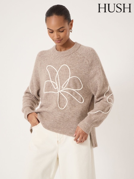 Hush Natural Wool Blend Crew Neck Jumper with Flower Motif