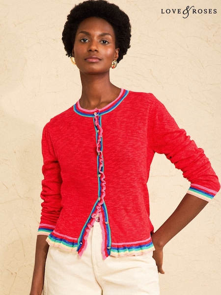 Love & Roses Red Frilled Multicolored Detail Knitted Cardigan