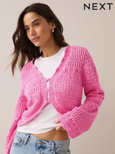 Fluro Pink Long Wide Sleeve Pointelle Button Through Cotton Cardigan