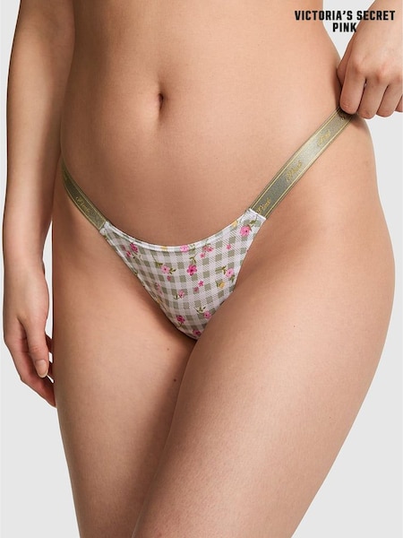 Victoria's Secret PINK Green Gingham Floral Print Mini Scoop Thong Cotton Logo Knickers