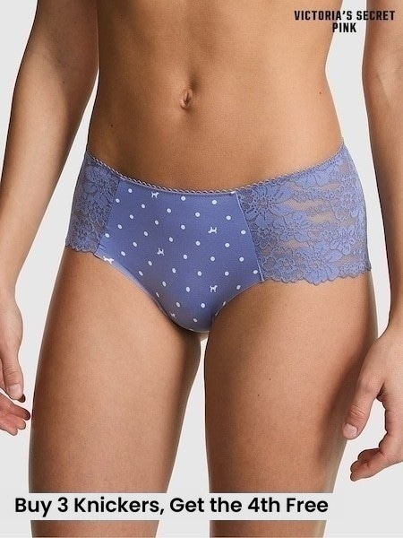 Victoria's Secret PINK Dusty Iris Blue Dog Print Hipster No Show Lace Trim Knicker