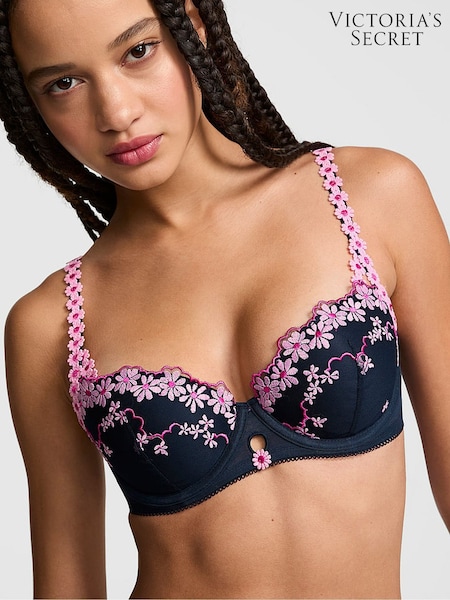 Victoria's Secret Pink Noir Navy Blue Push Up Daisy Embroidery Bra