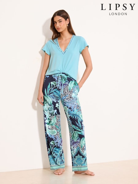 Lipsy Blue Animal Print Short Sleeve V-Neck T-Shirt And Trousers Jersey Pyjamas Set