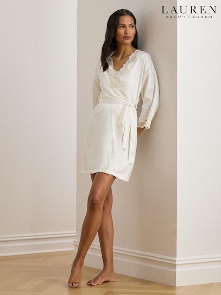 Lauren Ralph Lauren Cream Core Satin Woven Kimono Lace Robe