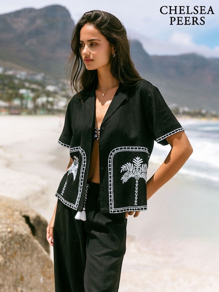 Chelsea Peers Black Linen-Blend Embroidered Short Sleeve Shirt