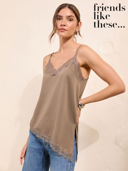 Friends Like These Brown Lace Trim Satin Asymmetric Cami