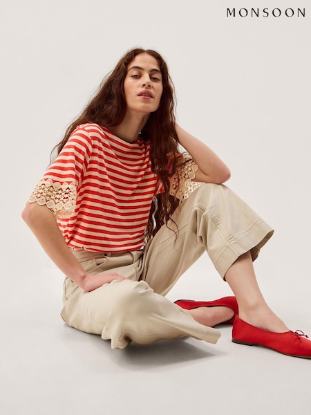 Monsoon Red Sasha Stripe Linen Blend T-Shirt