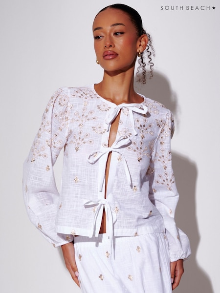 South Beach White Embroidered Mirror Disc Detail Tie Front Top