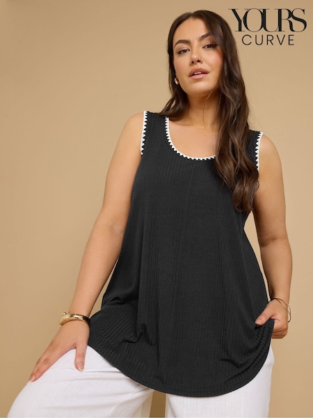 Yours Curve Black Contrast Blanket Stitch Ribbed Vest Top