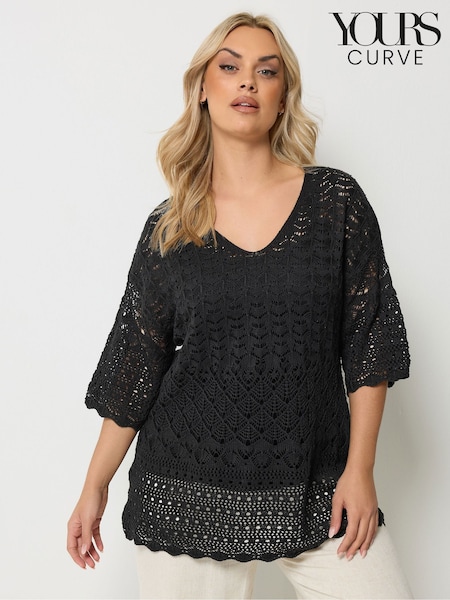 Yours Curve Chrome Black Crochet Tape Tie Front Blouse