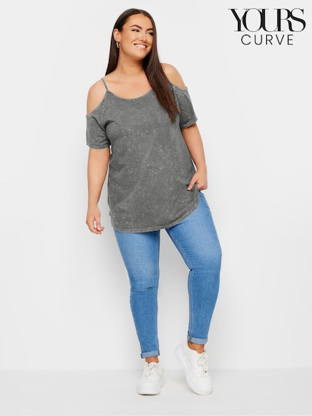 Yours Curve Grey Acid Wash Strappy Cold Shoulder T-Shirt