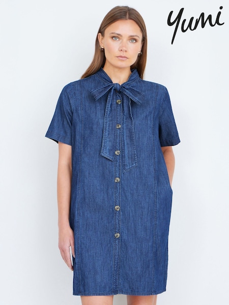 Yumi Blue Chambray Tunic With Pussy Bow Tie