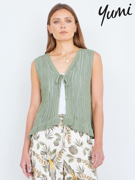 Yumi Green Knitted Cotton Tie Waistcoat Top