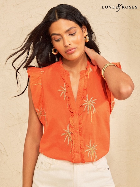 Love & Roses Orange 3D Palm Square Neck Blouse