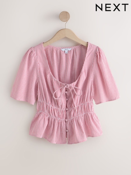 Red/White Stripe Tie Front Short Sleeve Blouse