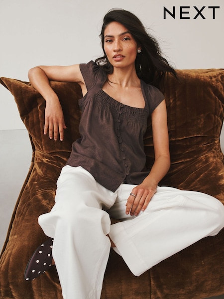 Chocolate Brown Flutter Sleeve Button Front Top With Linen