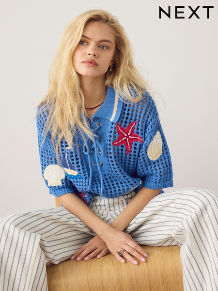 Blue Embroidered Print Cotton Mesh Knit Lace-Up Polo Top