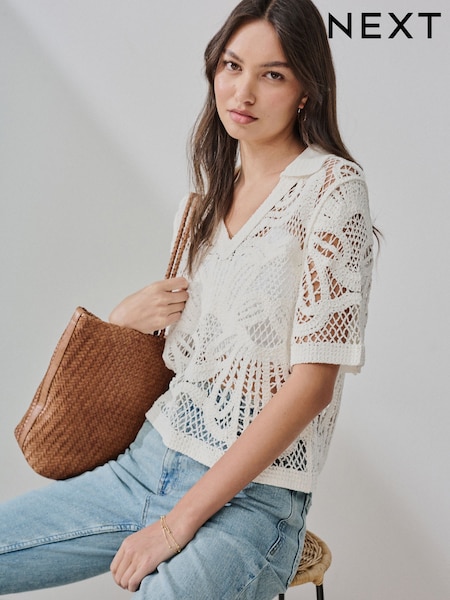 Reiss Ivory Pippa Open-Stitch Knitted Polo Top