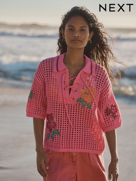 Pink Floral Embroidered Print Cotton Mesh Knit Lace-Up Polo Top