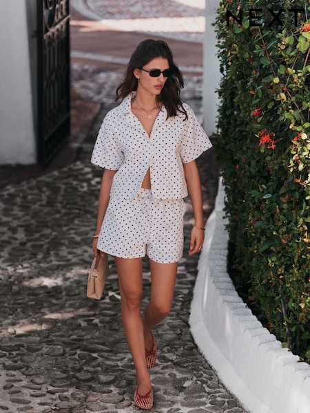 White/Black Polka Dot Short Sleeve Denim Shirt