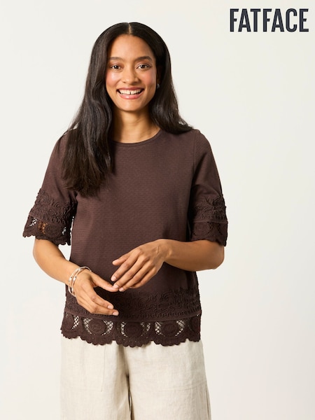 FatFace Chloe Chocolate Brown Crochet Detail T-Shirt