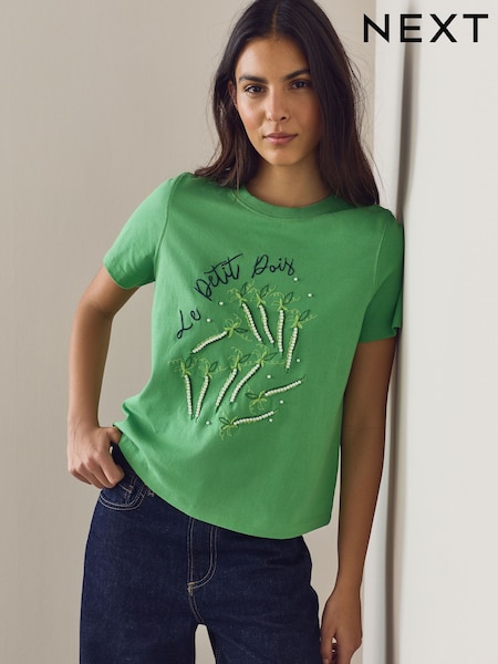 Green Embellished Petit Pois Short Sleeve Crew Neck T-Shirt