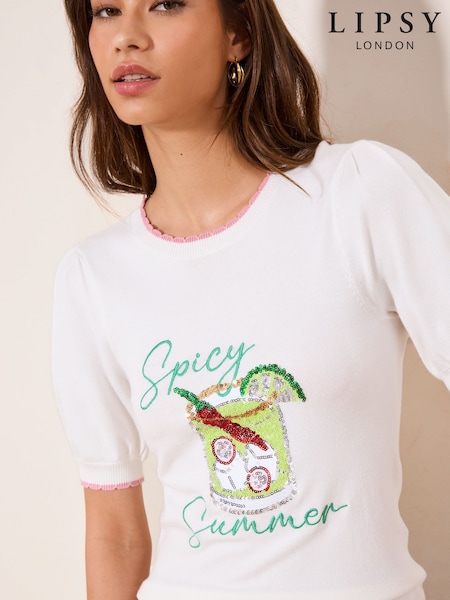 Lipsy Ivory White Sequin Summer Graphic Print Short Sleeve Knit T Shirt