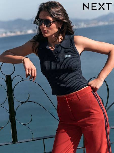 Navy Blue Sleeveless Knitted Polo Top