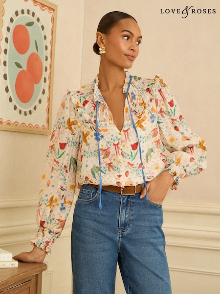 Love & Roses Ivory Printed Long Sleeve Notch Neck Shirred Blouse