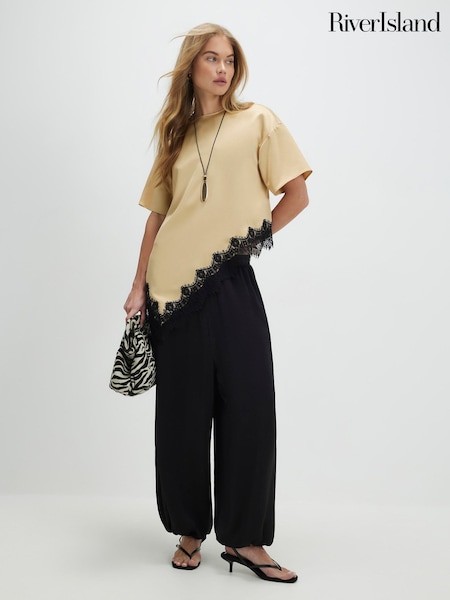 River Island Natural Short Sleeve Asymmetric Lace Satin T-Shirt
