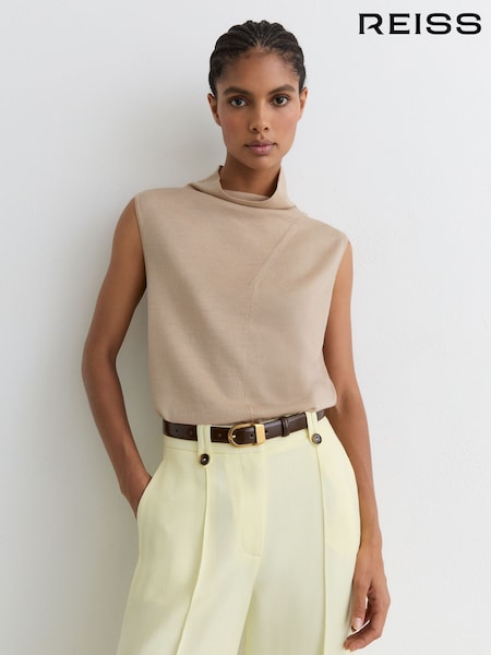 Reiss Neutral Honey Wool Funnel-Neck Sleeveless Knit Top