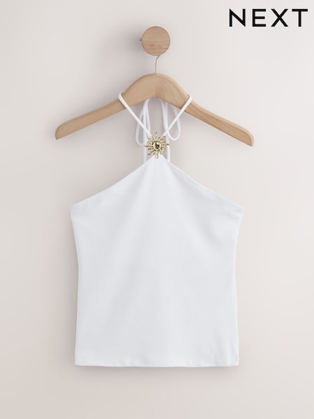 White Soft Touch Slinky Sleeveless Halter Neck Hardware Top