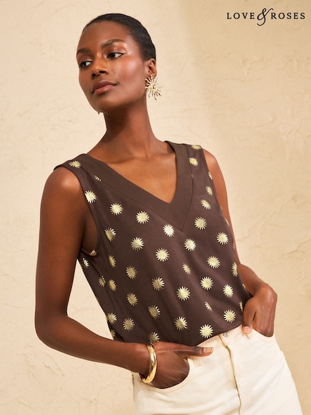 Love & Roses Chocolate Brown Sun Foil Print Chiffon Trim V-Neck Jersey Vest