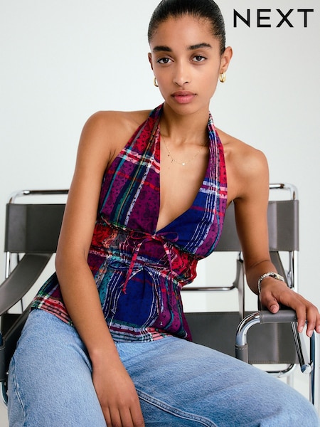Blue/Red Paisley Print Halterneck Tie-Front Top