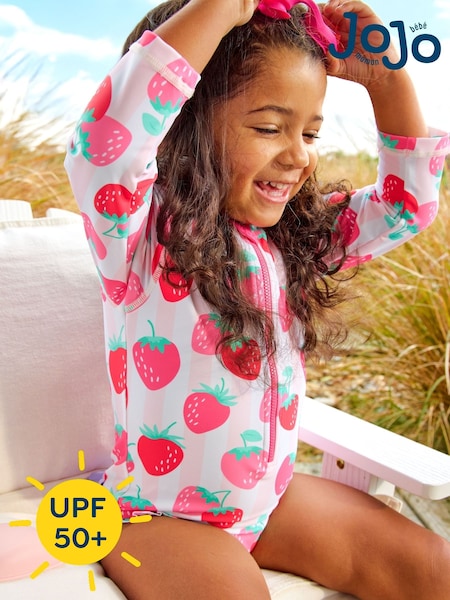 JoJo Maman Bébé Pink Strawberry Stripe Long Sleeve Sunsafe Swimsuit