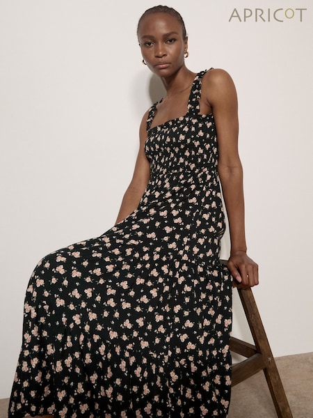 Apricot Charcoal Black Ditsy Floral Smocked Midi Dress