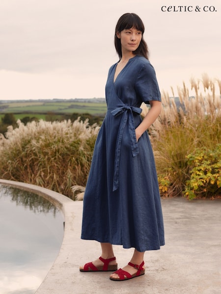 Celtic & Co. Blue Linen Blend Wrap Midi Dress