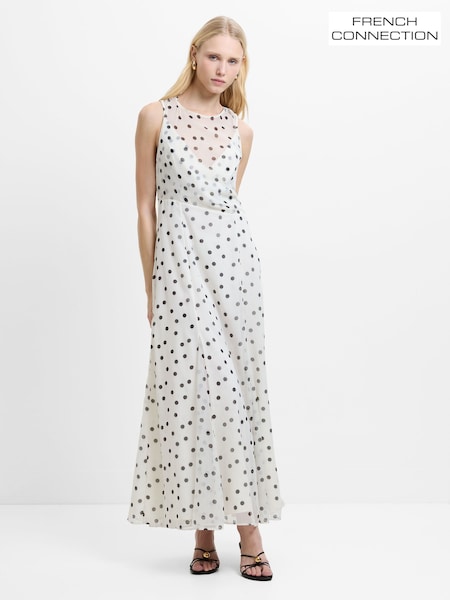 French Connection White Emina Chiffon Polka Dot Godet Dress