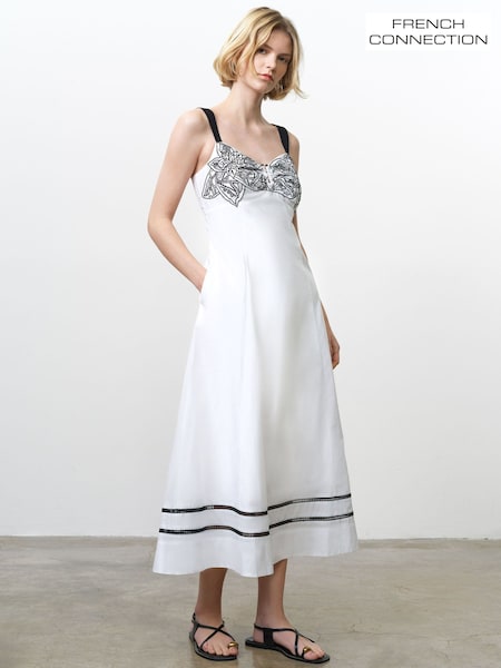 French Connection White Cambria Cotton Embroidered Bust Midi Dress