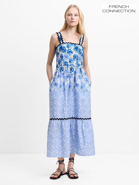 French Connection Blue Zaves Chambray Patterned Pin Tuck Sleeve Midi Dress