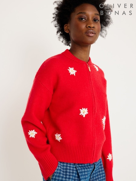 Oliver Bonas Red Daisy Embroidered Zip Up Knitted Bomber Jacket