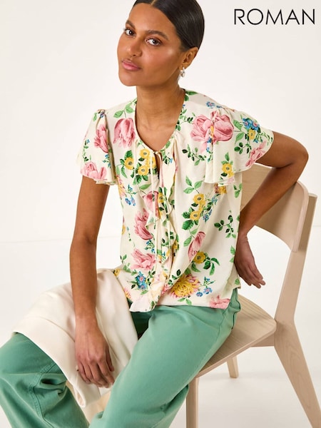 Roman Cream Crochet V-Neck 3/4 Sleeve 100% Cotton Tunic Top