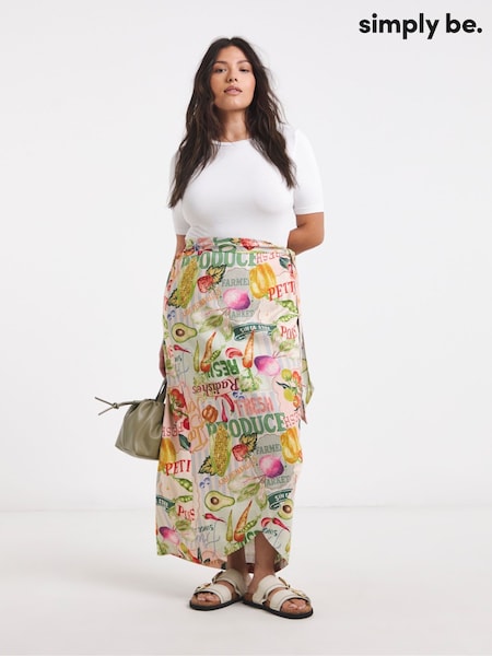 Simply Be Natural Postcard Print Frayed Edge Linen Wrap Skirt