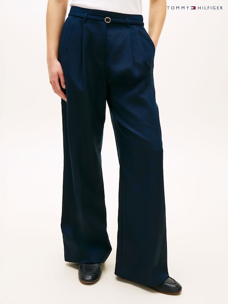 Tommy Hilfiger Blue Linen Blend Belted Wide Leg Trousers
