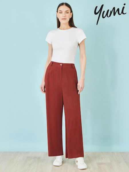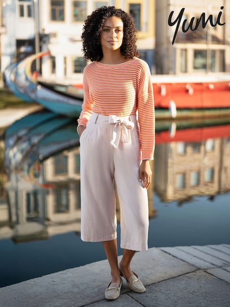 Yumi Natural Linen Mix Cropped Trousers With Tie Belt