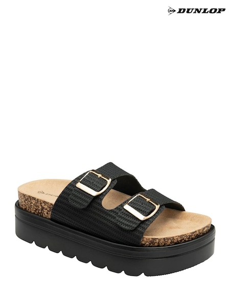 Dunlop Black Double Strap Footbed Wedge Mule Sandals