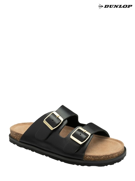 Dunlop Black Double Strap Leather Footbed Mule Sandals